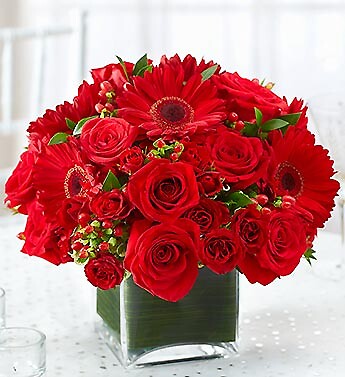 Classic elegance meets contemporary style with this centerpiece of red roses, Gerbera daisies, red spray roses and more, in a modern glass cube vase.